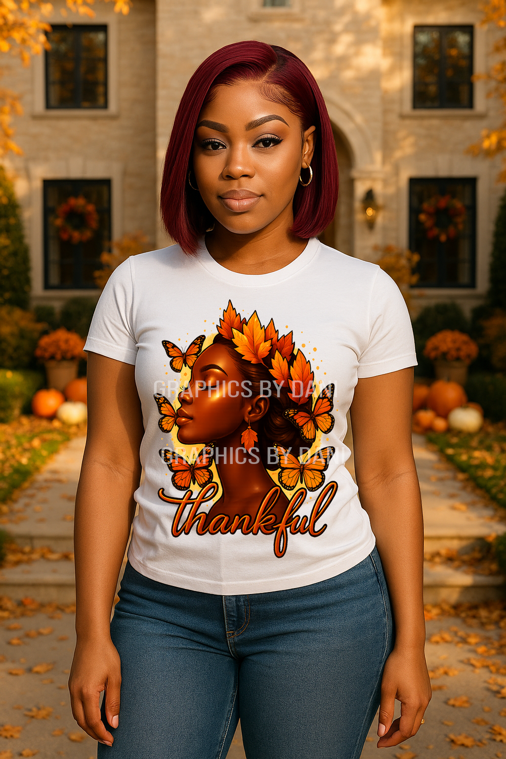 Celebrate the beauty of gratitude and fall with this Thankful Fall Queen PNG file only. This bold, vibrant, and glossy 2.5D design features a stunning Black woman with radiant brown skin, adorned with a crown of autumn leaves and surrounded by elegant monarch butterflies. The word “thankful” shines below in rich metallic script, creating a polished, high-end look perfect for your seasonal projects.