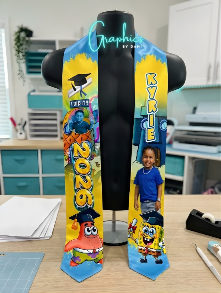 Celebrate your graduate in style with a fully custom graduation stole designed to make their big moment unforgettable!