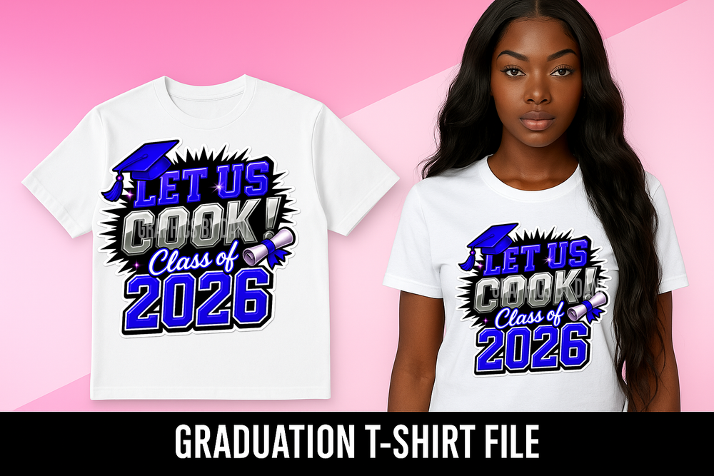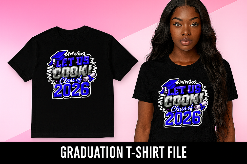 Celebrate the big moment in style with our bold and vibrant βLet Us Cook! Class of 2026β graduation design! Perfect for t-shirts, hoodies, mugs, banners, and more β this high-quality PNG features a striking mix of metallic silver, bold blue, and graduation-themed accents including a cap and diploma.