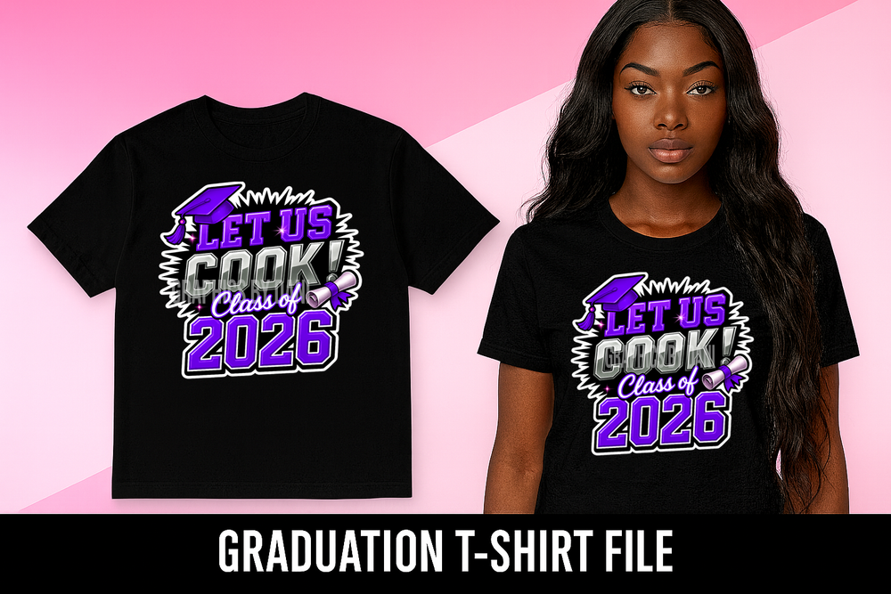 Celebrate the big moment in style with our bold and vibrant βLet Us Cook! Class of 2026β graduation design! Perfect for t-shirts, hoodies, mugs, banners, and more β this high-quality PNG features a striking mix of metallic silver, bold purple, and graduation-themed accents including a cap and diploma.