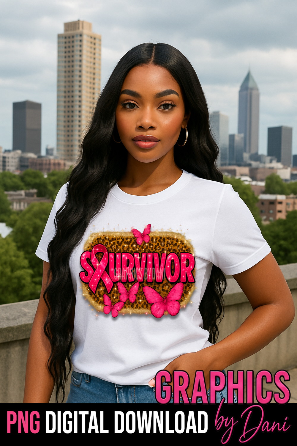Turn heads and celebrate strength with this bold, glossy “SURVIVOR” design. It features a hot-pink awareness ribbon, sparkling highlights, soft pink butterflies, and a leopard splash for that glam pop you love. Perfect for DTF/DTG prints, sublimation, screen-print transfers, and printable crafts.