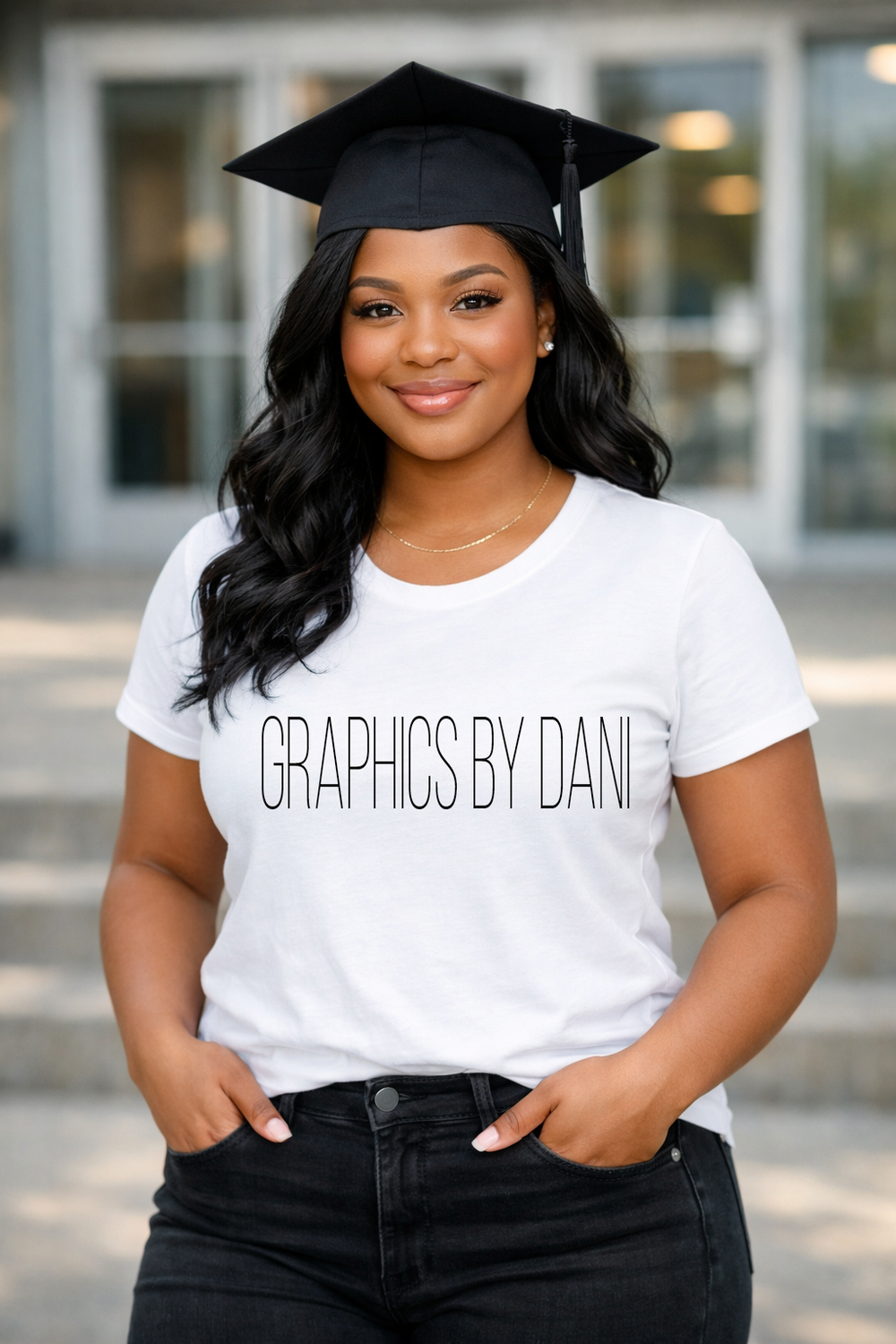 This stunning graduation-themed portrait features a confident young Black woman standing in front of a modern campus building, wearing a graduation cap, a clean white t-shirt, and black jeans. The image has a bright, professional, and celebratory look β perfect for graduation announcements, flyers, keepsakes, social media posts, and more.